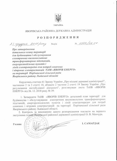 №1344/02-06 2019-01-03 Про затвердження детального плану території для будівництва і обслуговування електричних високовольтних трасформаторних підстанцій , енергорозподільних пунктів і ліній електропередач для потреб сонячних і вітрових електростанцій ТзОВ "ЯВОРІВ ЕНЕРГО" на території Порічанської сільської ради Яворівського району Львівської області
