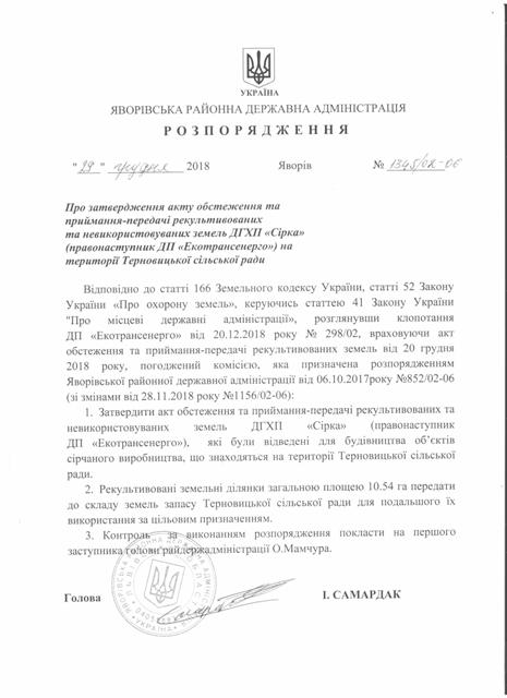 №1345/02-06 2019-01-03 Про затвердження акту обстеження та приймання-передачі рекультивованих земель ДГХП "Сірка" ( правонаступник ДП "Електротрансенерго") на території Терновицької сільської ради
