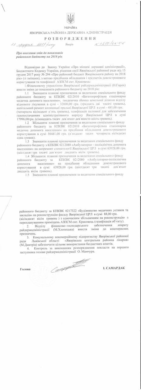 №1250/02-06 2018-12-21 Про внесення змін до показників районного бюджету на 2018 рік