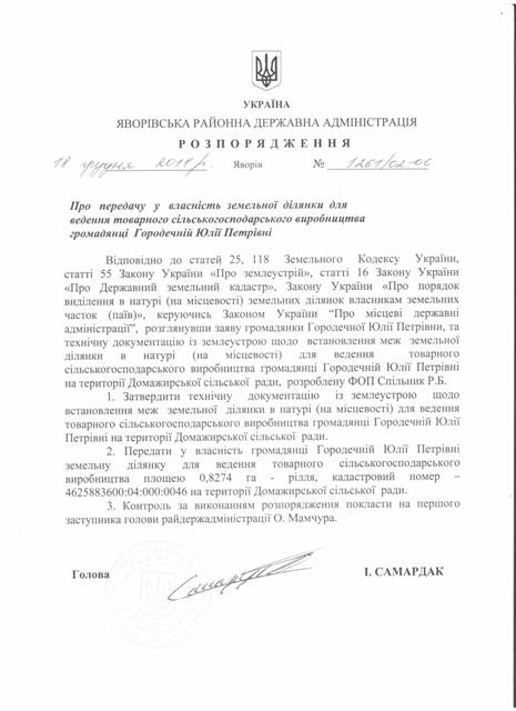 №1261/02-06 2018-12-21 Про передачу у власність земельної ділянки для ведення товарного сільськогосподарського виробництва громадянці Городечній Юлії Петрівні