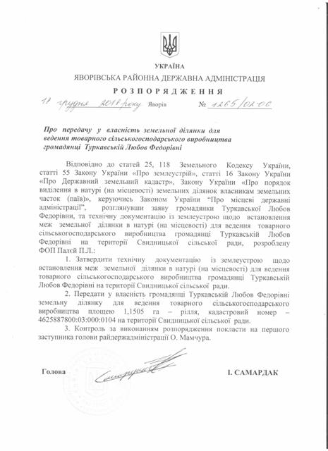 №1265/02-06 2018-12-21 Про передачу у власність земельної ділянки для ведення товарного сільськогосподарського виробництва громадянці Туркавській Любов Федорівні