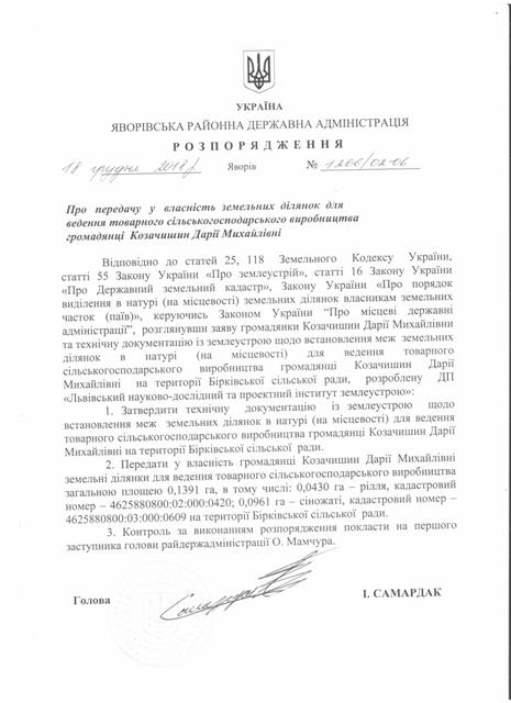 №1266/02-06 2018-12-21 Про передачу у власність земельних ділянок для ведення товарного сільськогосподарського виробництва громадянці Козачишин Дарії Михайлівні