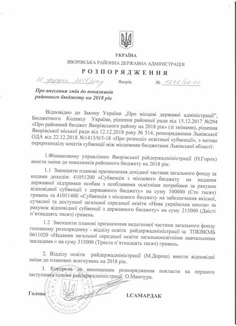 №1292/02-06 2018-12-27 Про внесення змін до показників районного бюджету на 2018 рік