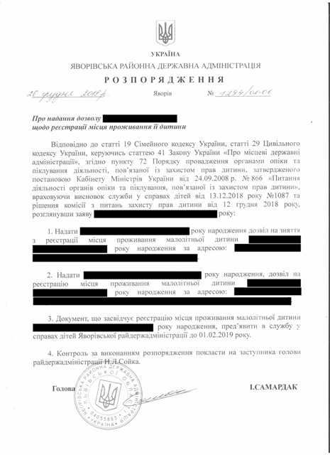 №1294/02-06 2018-12-27 Про надання дозволу щодо реєстрації місця проживання її дитини