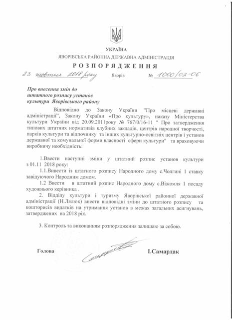 Про внесення змін до штатного розпису установ культури Яворівського району |