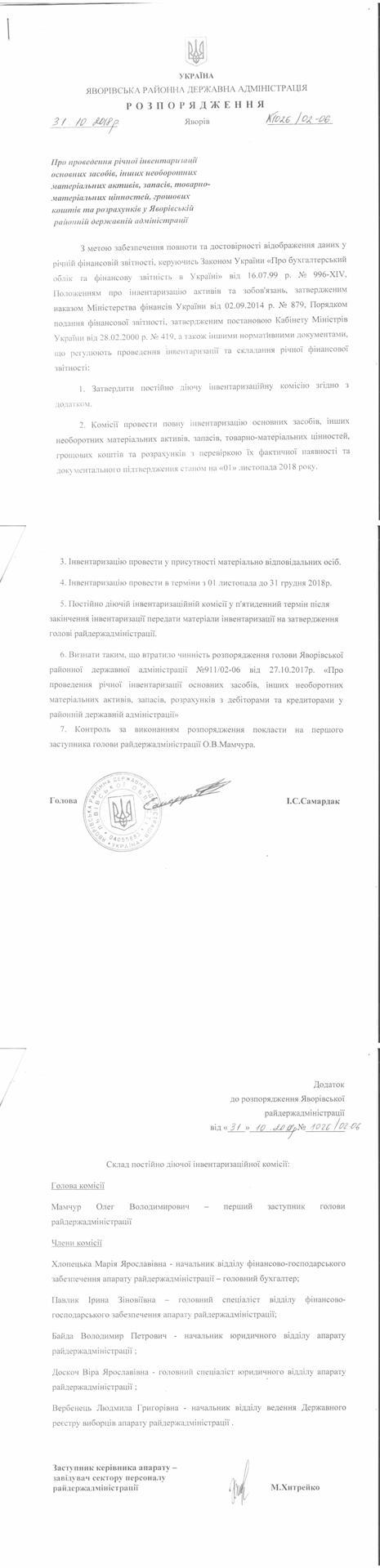 Про проведення річної інвентаризації основних засобів , інших необоротних матеріальних активів , запасів , товарно-матеріальних цінностей , грошових коштів та розрахунків у Яворівській районній державній адміністрації (Втратило чинність) |