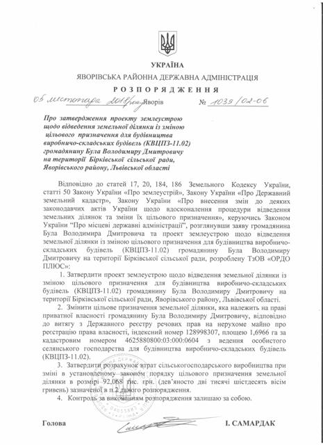 Про затвердження проекту землеустрою щодо відведення земельної ділянки із зміною цільового призначення для будівництва виробничо-складських будівель (КВЦПЗ-11.02) громадянину Була Володимиру Дмитровичу на території Бірківської сільської ради, Яворівського району, Львівської області |
