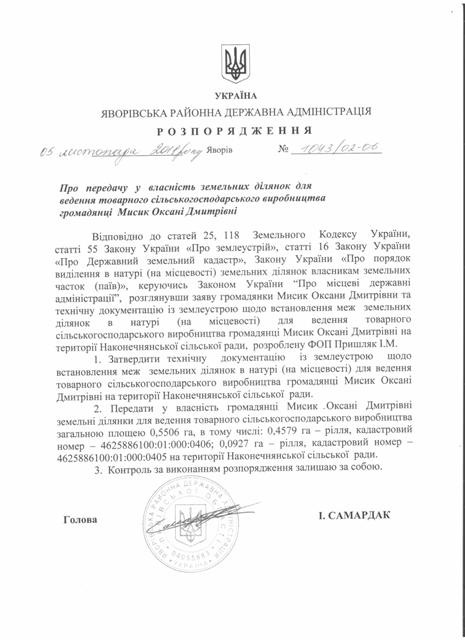 Про передачу у власність земельних ділянок для ведення товарного сільськогосподарського виробництва громадянці Мисик Оксані Дмитрівні |