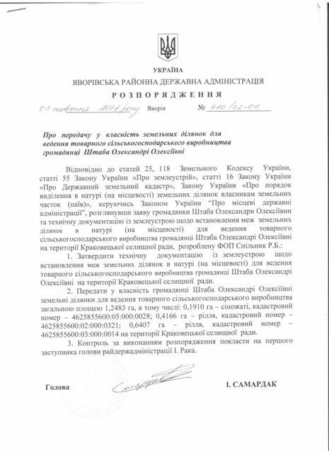 №910/02-06 2018-10-04 Про передачу у власність земельних ділянок для ведення товарного сільськогосподарського виробництва громадянці Штаба Олександрі Олексіївні