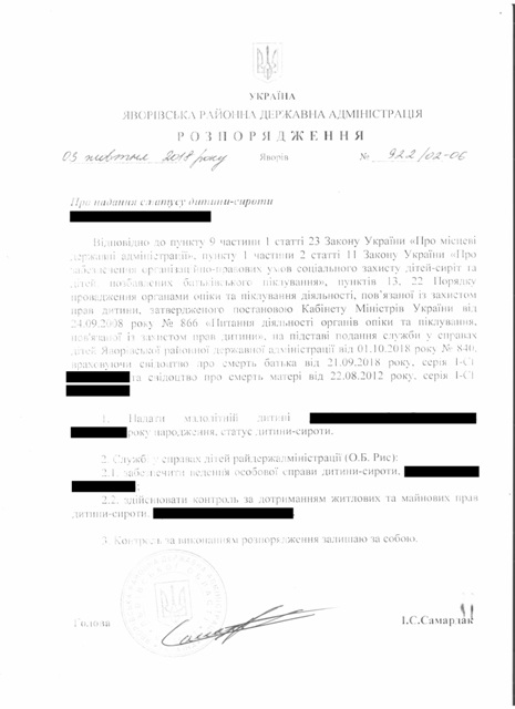 №922/02-06 2018-10-05 Про надання статусу дитини-сироти