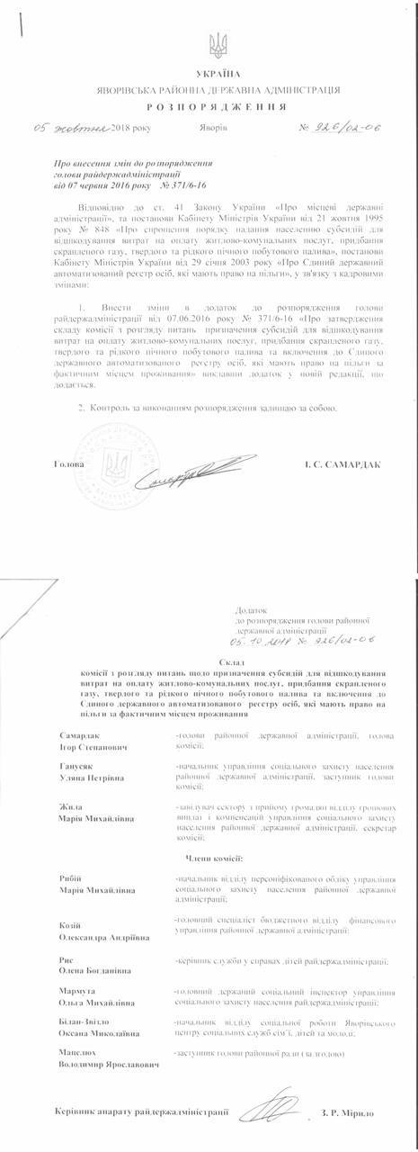 №926/02-06 2018-10-10 Про внесення змін до розпорядження голови райдержадміністрації від 07 червня 2016 року № 371/6-16