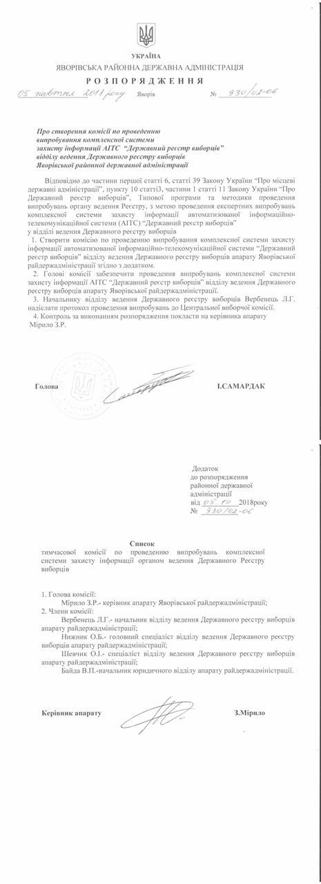 №930/02-06 2018-10-10 Про створення комісії по проведенню випробування комплексної системи захисту інформації АІТС "Державний реєстр виборців" відділу ведення Державного реєстру виборців Яворівської районної державної адміністрації