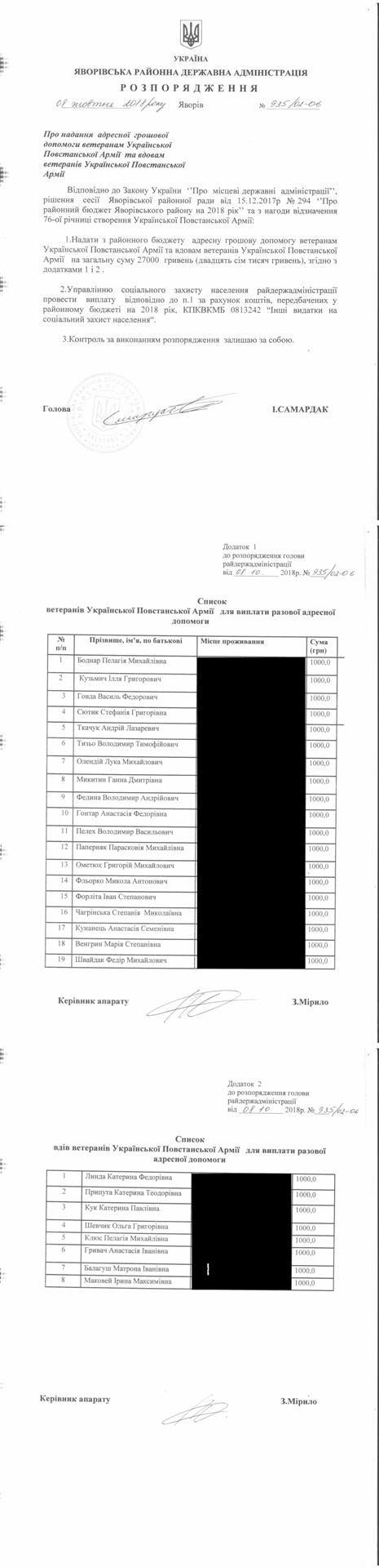 №935/02-06 2018-10-11 Про надання адресної грошової допомоги ветеранам Української Повстанської Армії та вдовам ветеранів Української Повстанської Армії