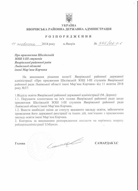 №945/02-06 2018-10-17 Про присвоєння Шклівській ЗОШ І-ІІІ ступенів Яворівської районної ради Львівської області імені Мар"яна Корчака