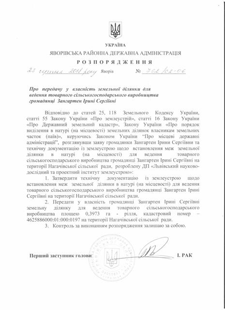 №762/02-06 2018-08-29 Про передачу у власність земельної ділянки для ведення товарного сільськогосподарського виробництва громадянці Зангартен Ірині Сергіївні