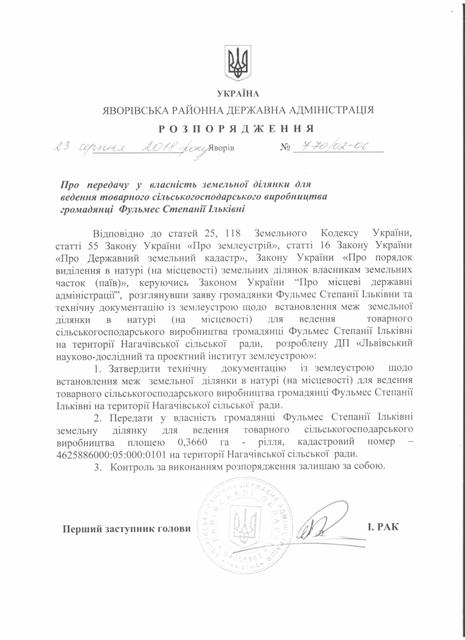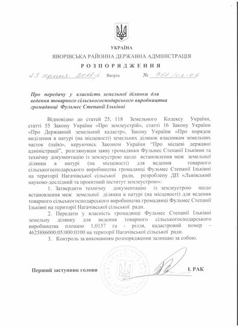 №770/02-06 2018-08-29 Про передачу у власність земельної ділянки для ведення товарного сільськогосподарського виробництва громадянці Фульмес Степанії Ільківні