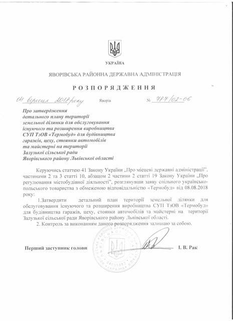 №787/02-06 2018-09-07 Про затвердження детального плану території земельної ділянки для обслуговування існуючого та розширення виробництва СУП ТзОВ "Термобуд" для будівництва гаражів , цеху, стоянки автомобілів та майстерні на території Залузької сільської ради Яворівського району Львівської області