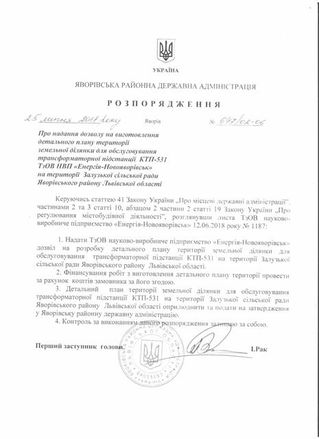 №647/02-06 2018-07-27 Про надання дозволу на виготовлення детального плану території земельної ділянки для обслуговування трансформаторної підстанції КТП-531 ТзОВ НВП "Енергія-Новояворівськ" на території Залузької сільської ради Яворівського району Львівської області