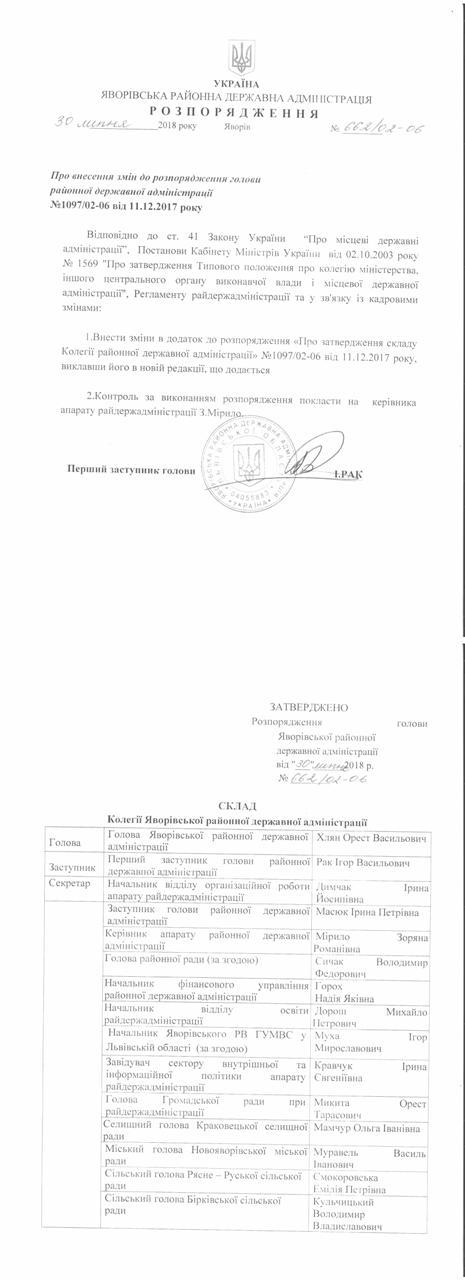 №662/02-06 2018-08-01 Про внесення змін до розпорядження голови районної державної адміністрації № 1097/02-06 від 11.12.2017 року