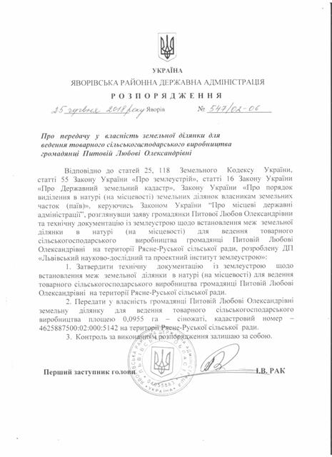 №547/02-06 2018-07-02 Про передачу у власність земельної ділянки для ведення товарного сільськогосподарського виробництва громадянці Питовій Любові Олександрівні