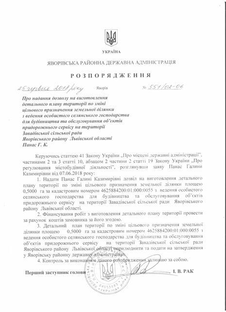 №551/02-06 2018-07-02 Про надання дозволу на виготовлення детального плану території по зміні цільового призначення земеньної ділянки з ведення особистого селянського господарства для будівництва та обслуговування об"єктів придорожного сервісу на території Завадівської сільської ради Яворівського району Львівської області Панас Г.К.