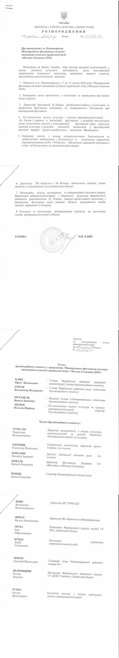 №563/02-06 2018-07-04 Про проведення у м. Новояворівськ Міжнародного фестивалю молодих виконавців сучасної української пісні "Молода Галичина 2018"