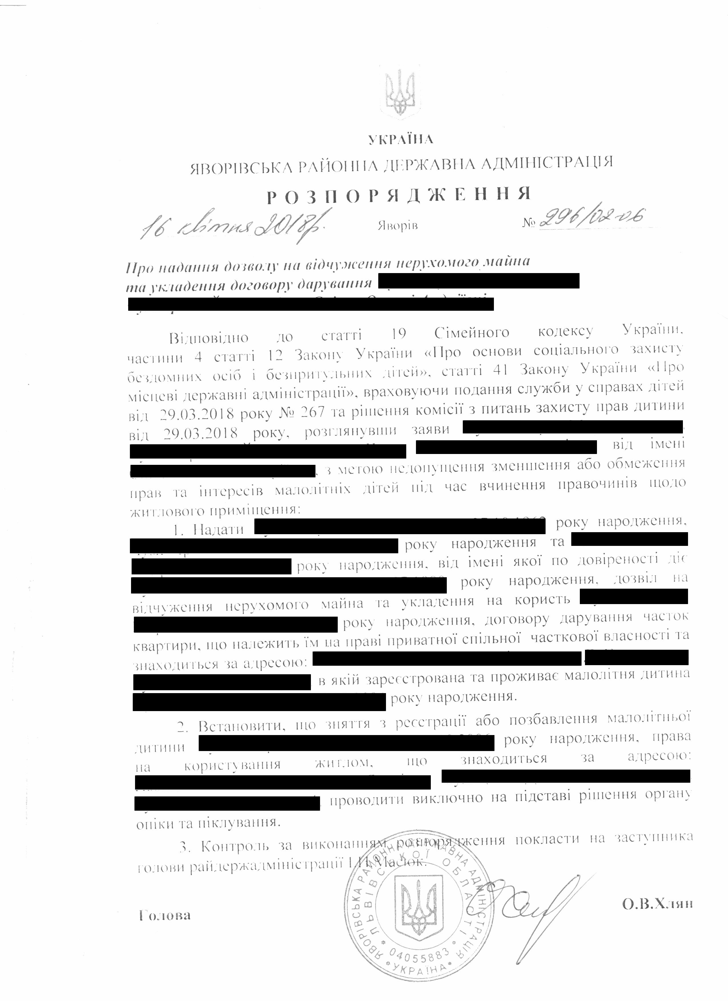 №296/02-06 2018-04-20 Про надання дозволу на відчуження нерухомого майна та укладення договору дарування