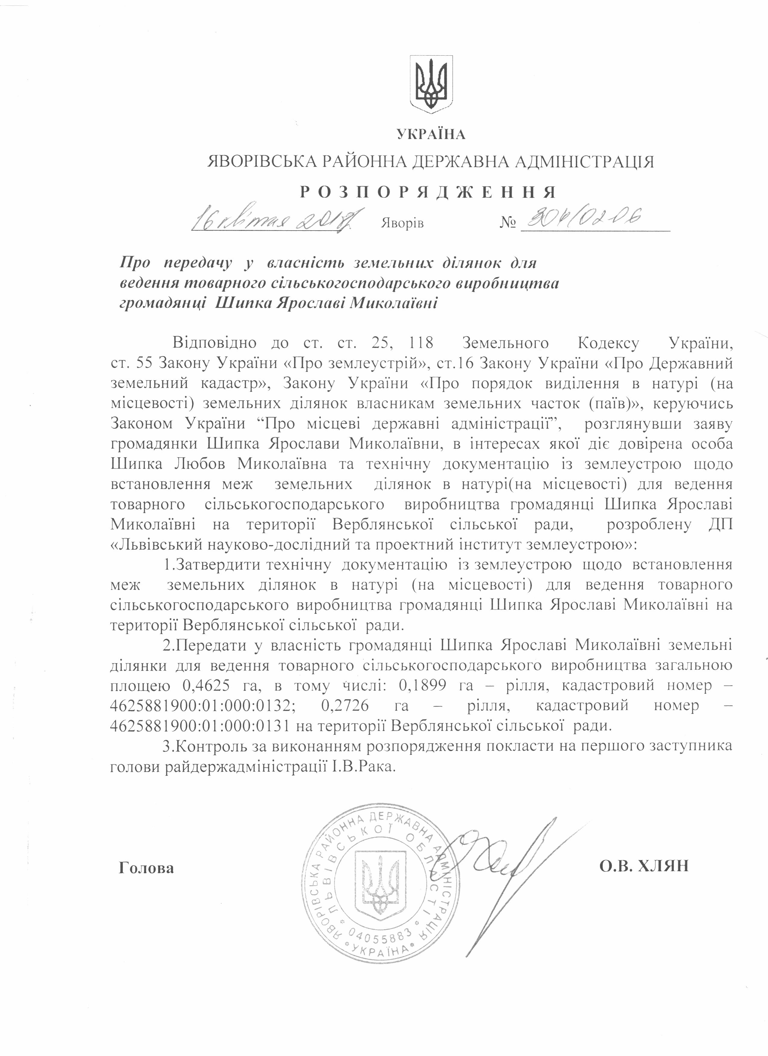 №304/02-06 2018-04-20 Про передачу у власність земельних ділянок для ведення товарного сільськогосподарського виробництва громадянці Шипка Ярославі Миколаївні