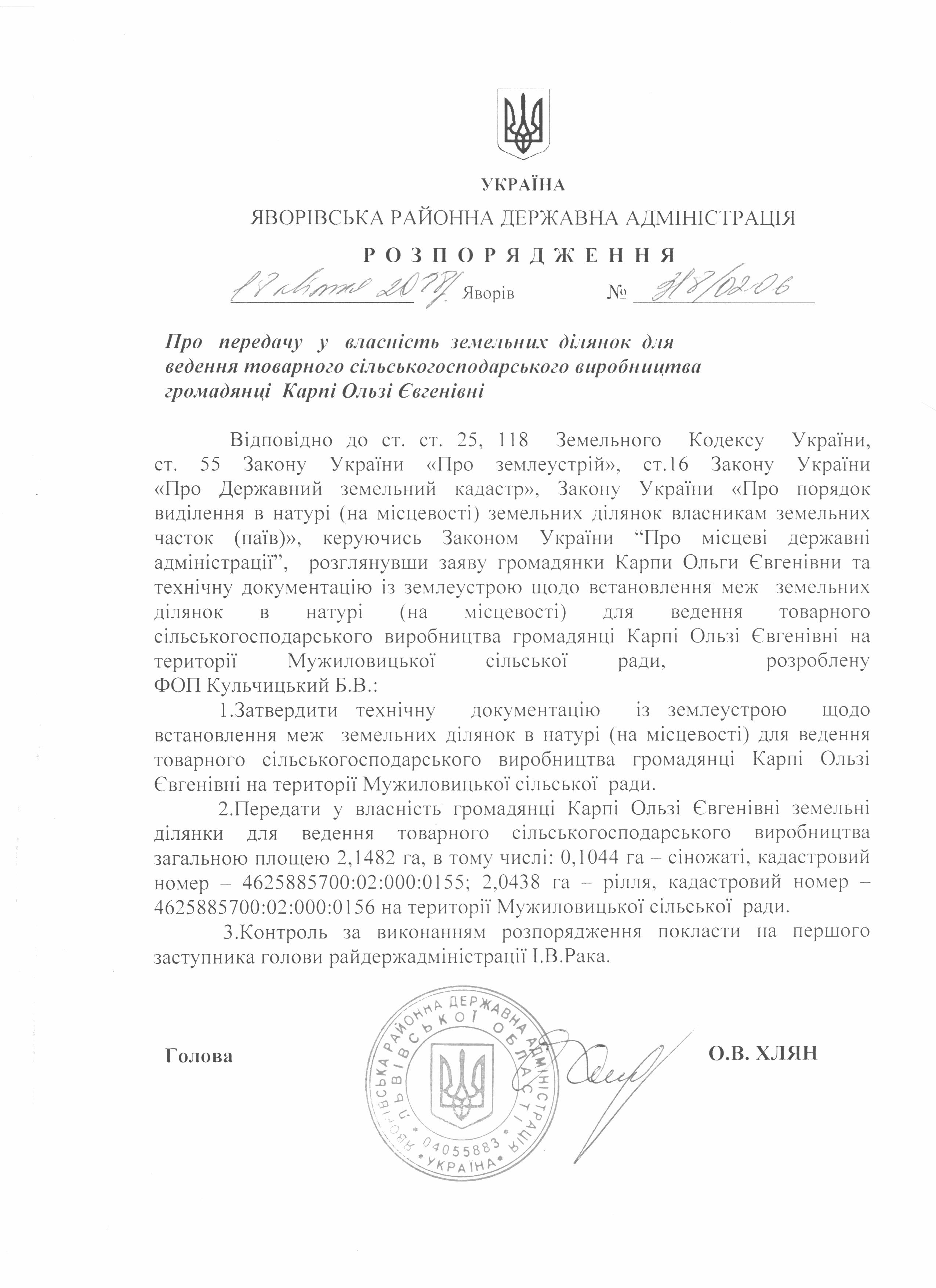 №318/02-06 2018-04-23 Про передачу у власність земельних ділянок для ведення товарного сільськогосподарського виробництва громадянці Карпі Ользі Євгенівні