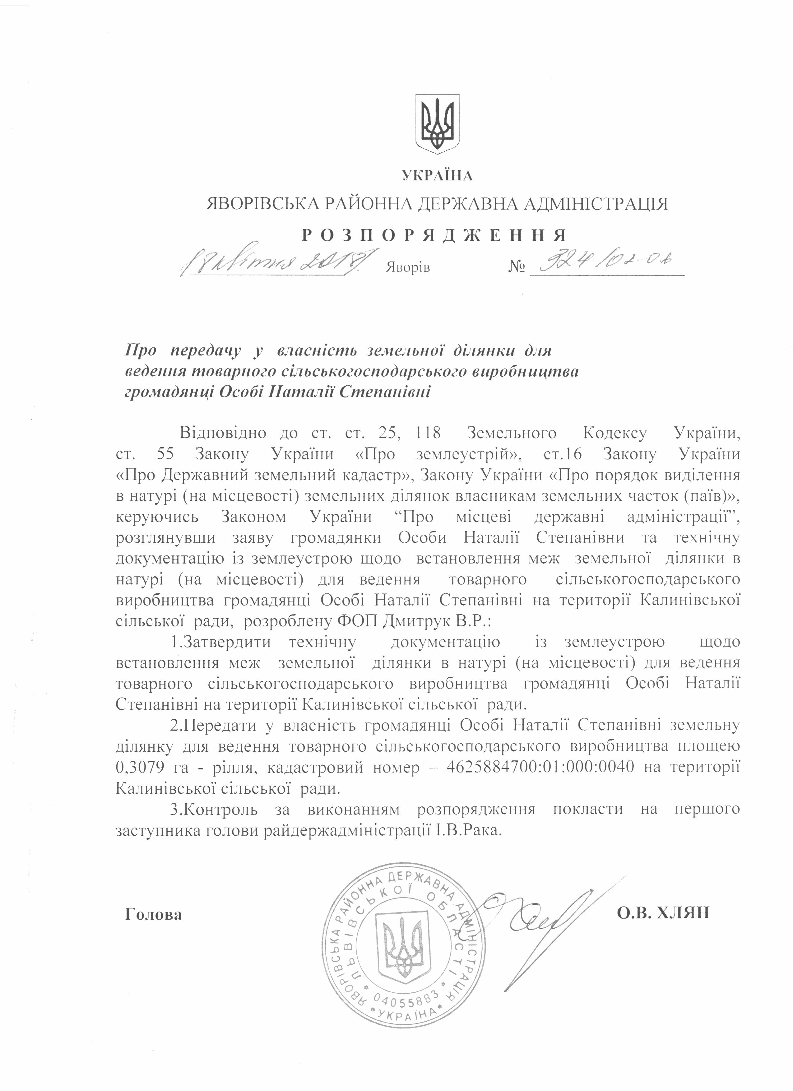 №324/02-06 2018-04-23 Про передачу у власність земельної ділянки для ведення товарного сільськогосподарського виробництва громадянці Особі Наталії Степанівні