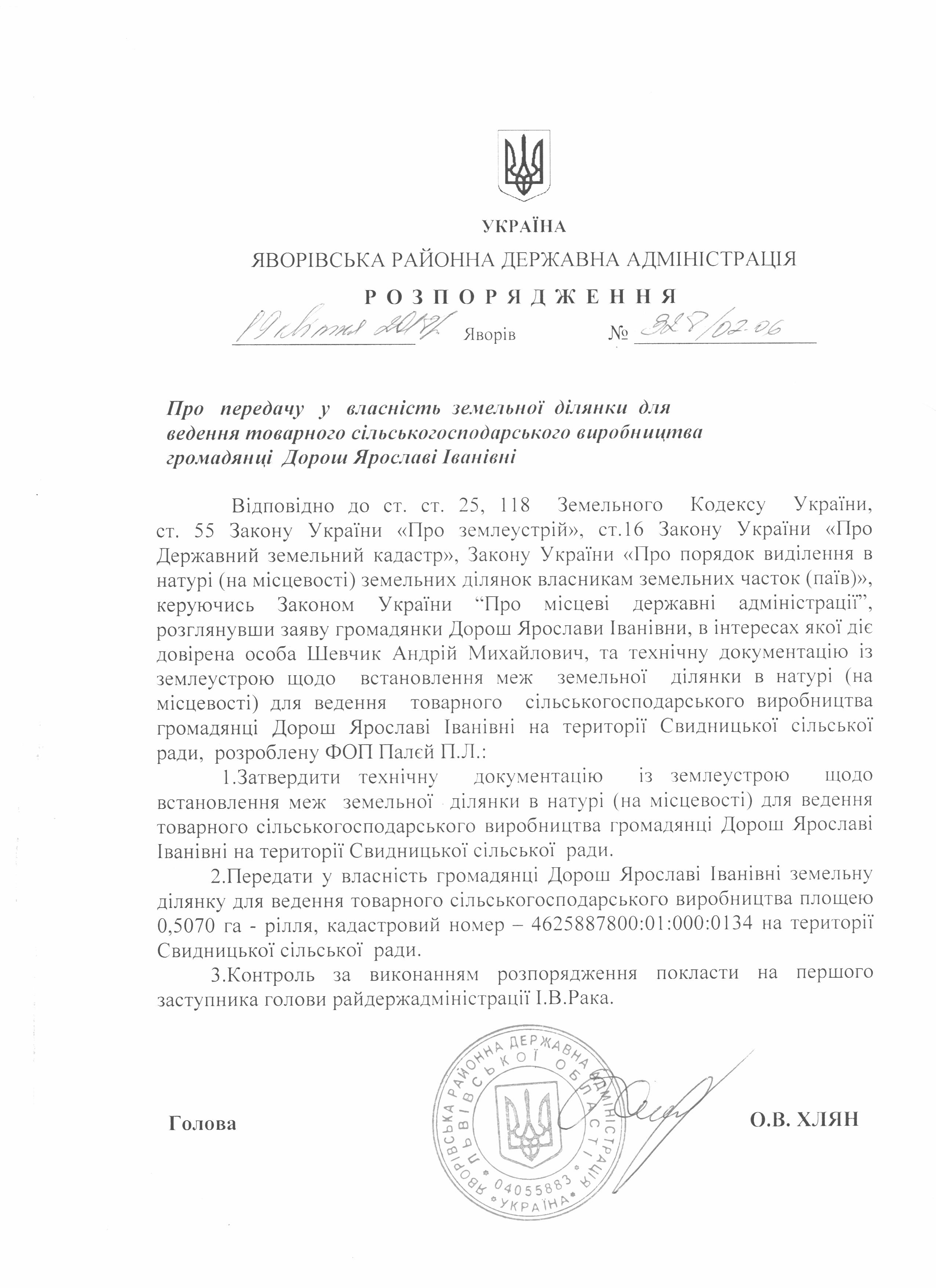 №328/02-06 2018-04-25 Про передачу у власність земельної ділянки для ведення товарного сільськогосподарського виробництва громадянці Дорош Ярославі Іванівні