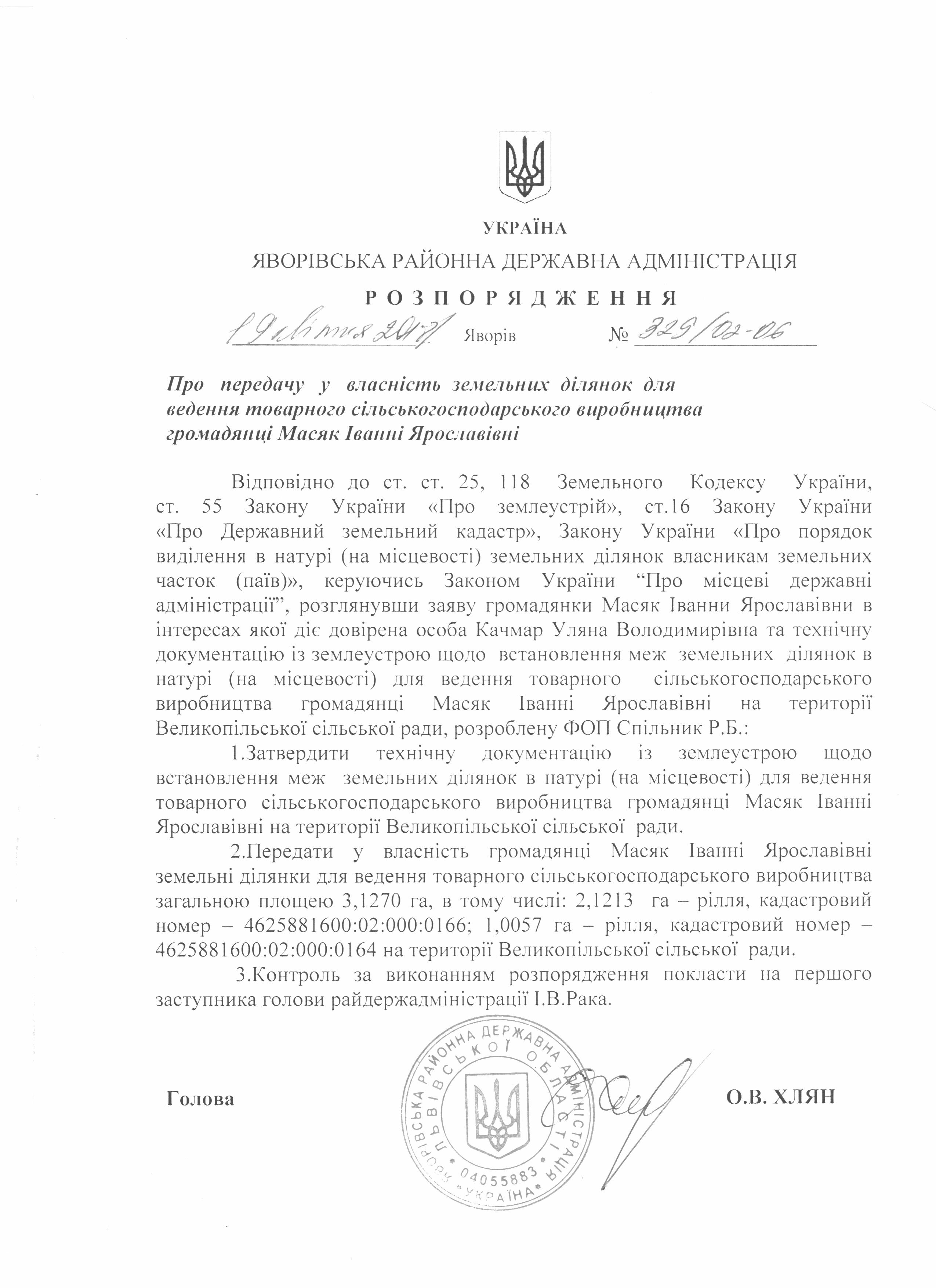№329/02-06 2018-04-25 Про передачу у власність земельних ділянок для ведення товарного сільськогосподарського виробництва громадянці Масяк Іванні Ярославівні