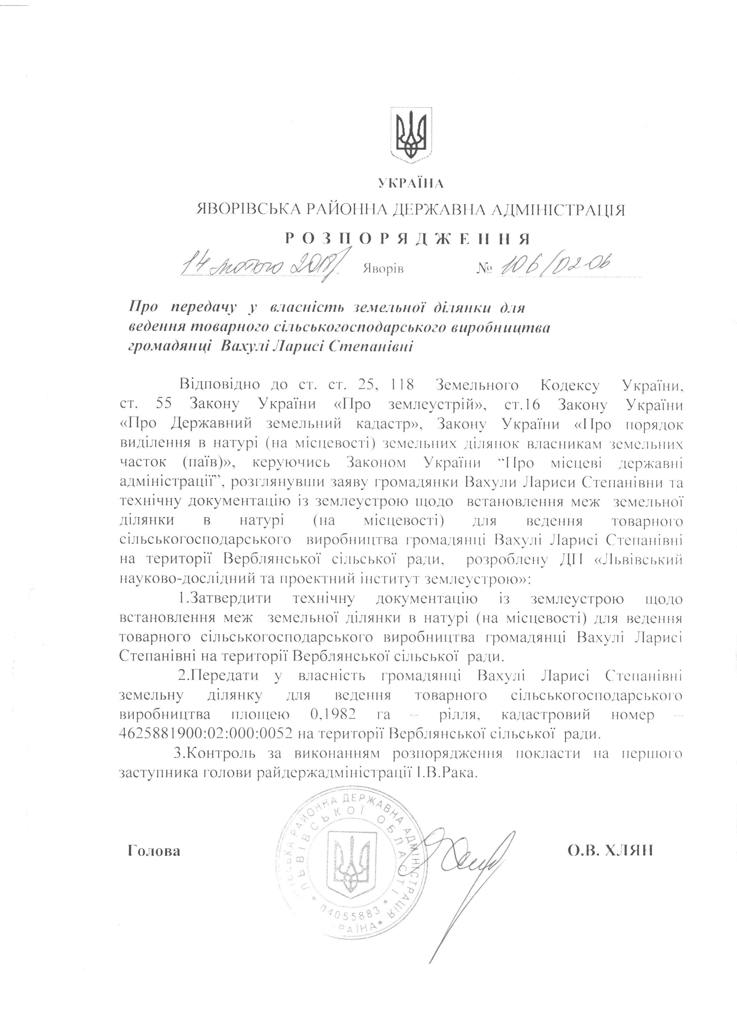 №106/02-06 2018-02-19 Про передачу у власність земельної ділянки для ведення товарного сільськогосподарського виробництва громадянці Вахулі Ларисі Степанівні