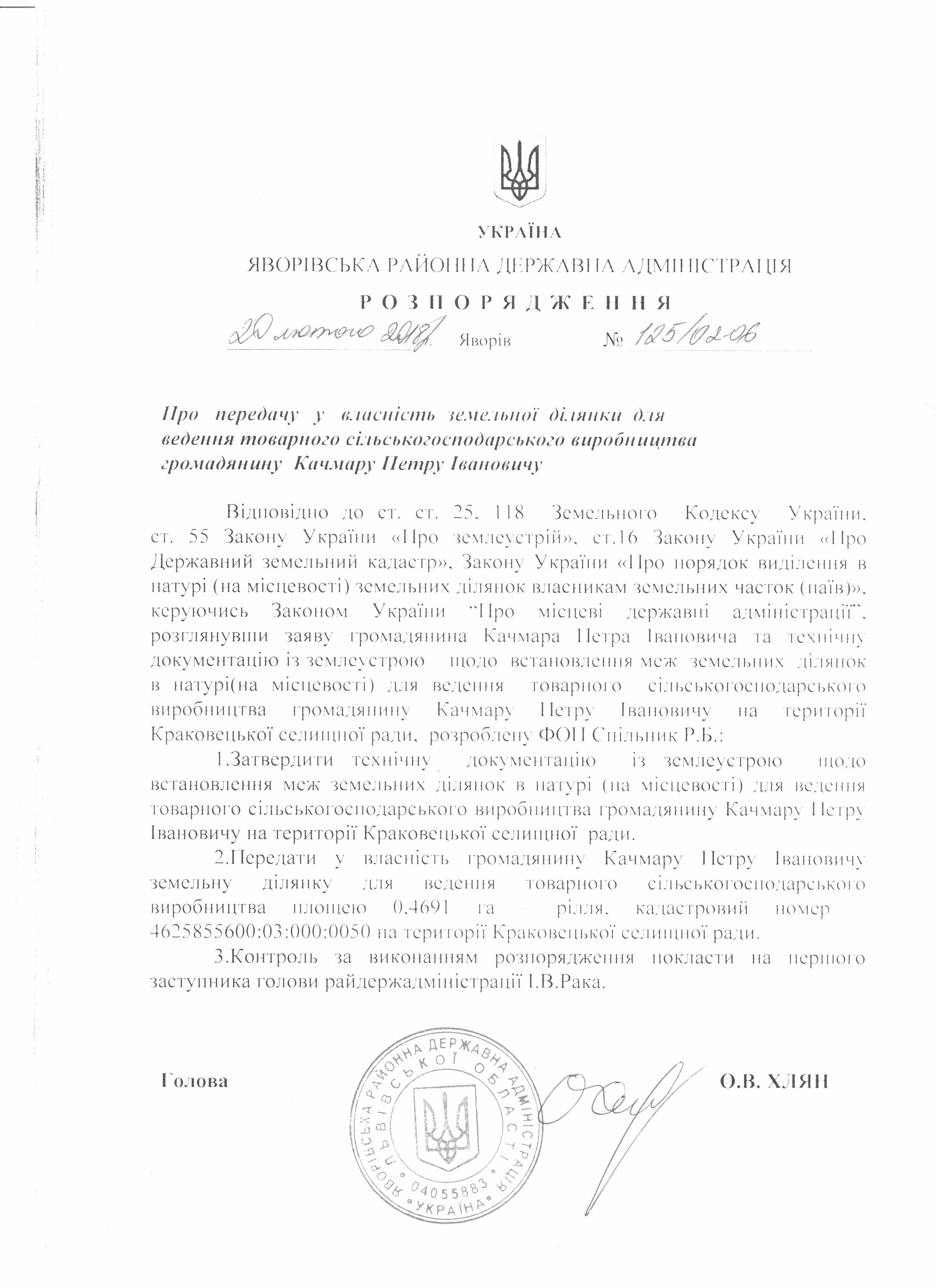 №125/02-06 2018-02-23 Про передачу у власність земельної ділянки для ведення товарного сільськогосподарського виробництва громадянину Качмару Петру Івановичу