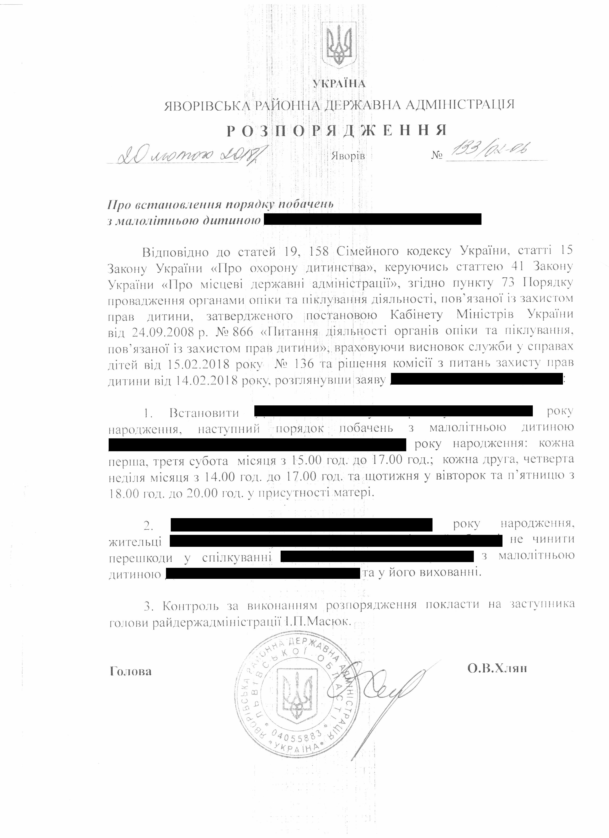 №133/02-06 2018-02-23 Про встановлення порядку побачень з малолітньою дитиною