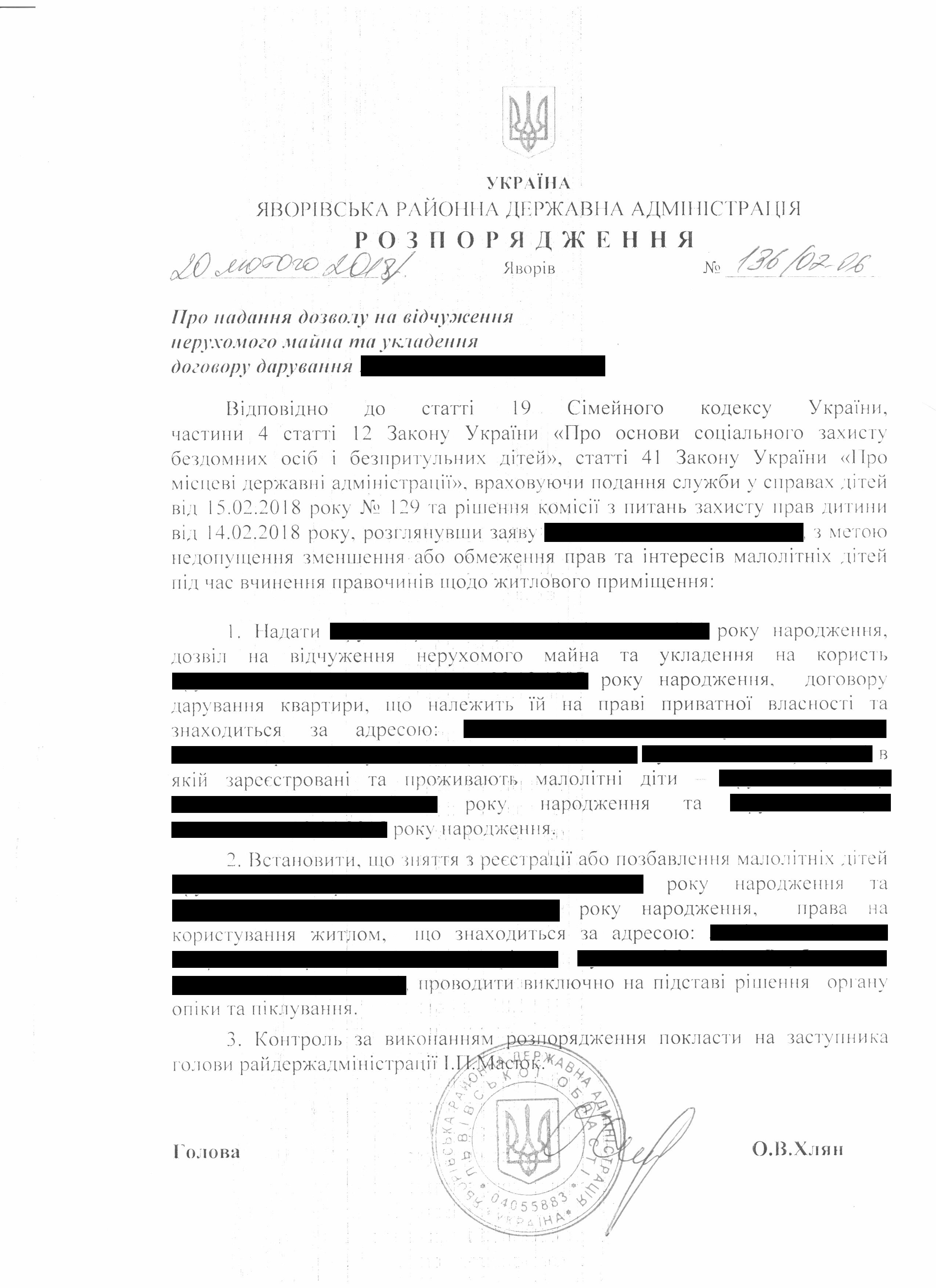 №136/02-06 2018-02-23 Про надання дозволу на відчуження нерухомого майна та укладення договору дарування