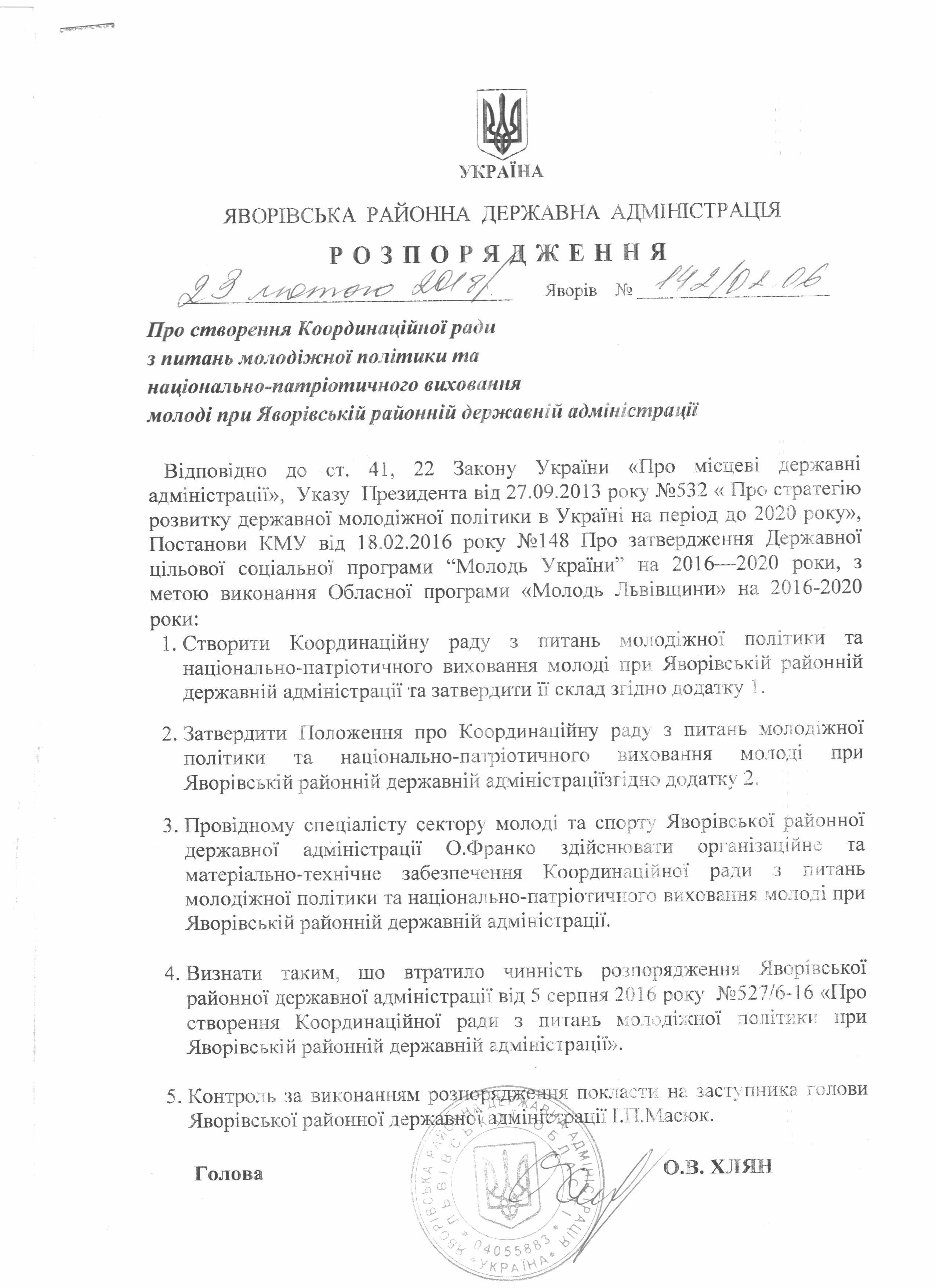 №142/02-06 2018-03-01 Про створення Координаційної ради з питань молодіжної політики та національно-патріотичного виховання молоді при Яворівській районній державній адміністрації