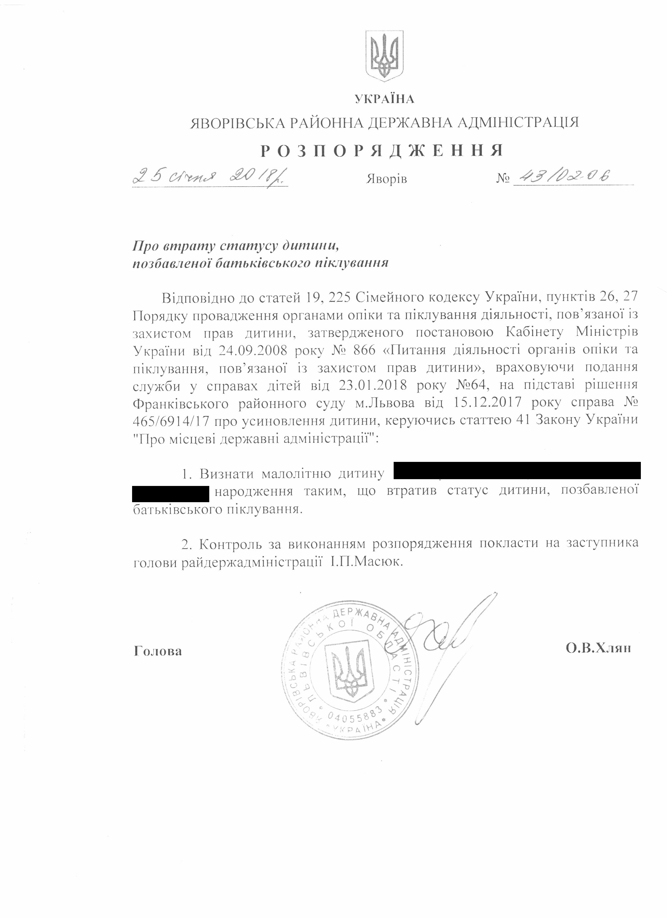 №43/02-06 2018-01-30 Про втрату статусу дитини, позбавленої батьківського піклування