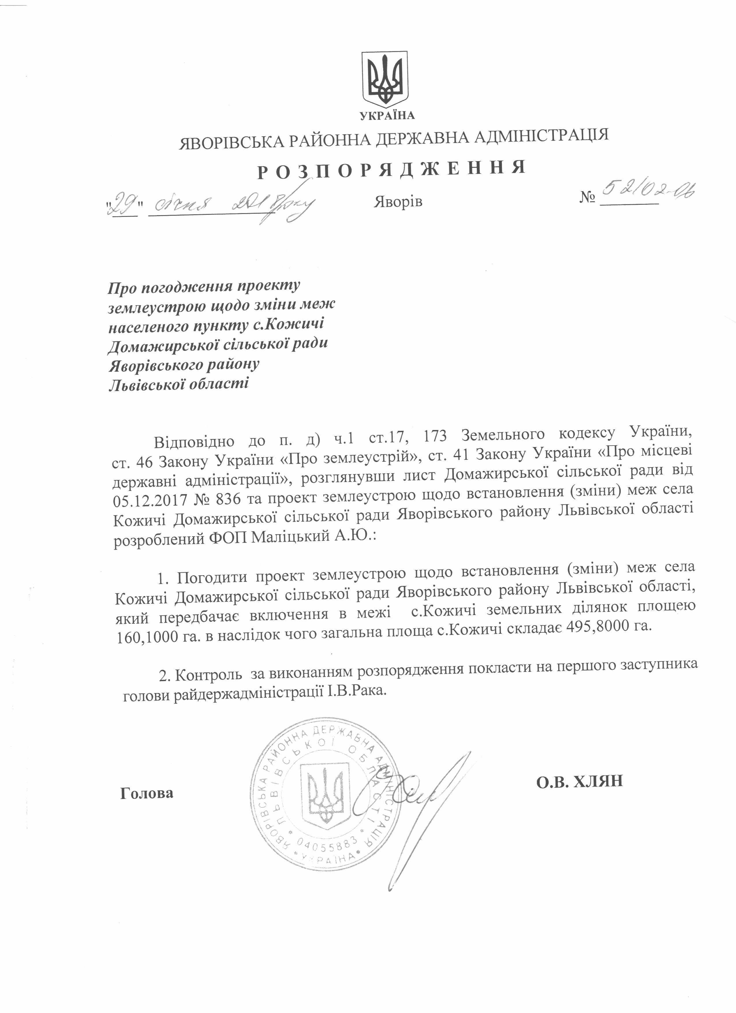 №52/02-06 2018-01-30 Про погодження проекту землеустрою щодо зміни меж населеного пункту с. Кожичі Домажирської сільської ради Яворівського району Львівської області