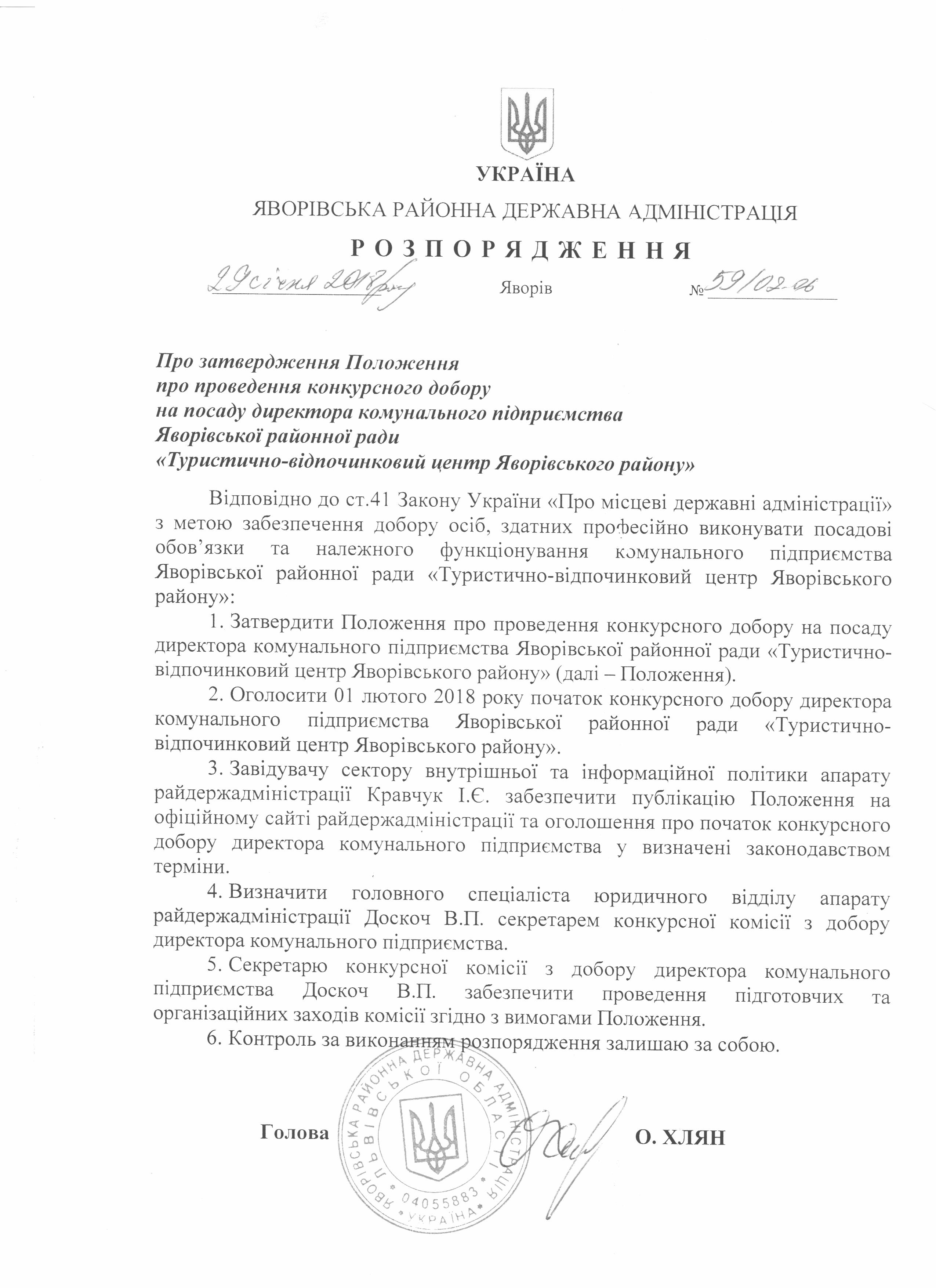 №59/02-06 2018-01-30 Про затвердження Положення про проведення конкурсного добору на посаду директора комунального підприємства Яворівської районної ради "Туристично-відпочинковий центр Яворівського району"