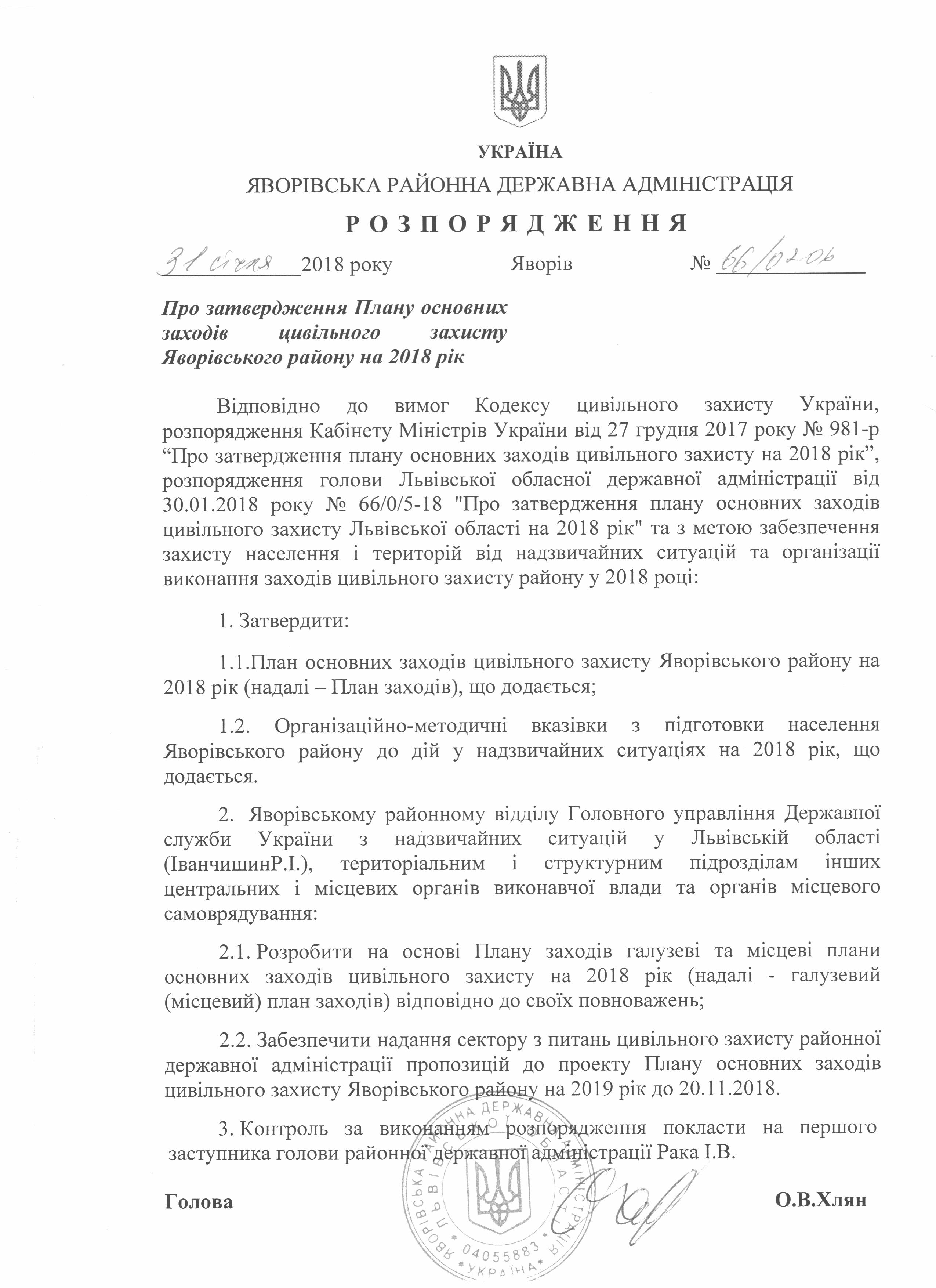 №66/02-06 2018-02-02 Про затвердження Плану основних заходів цивільного захисту Яворівського району на 2018 рік