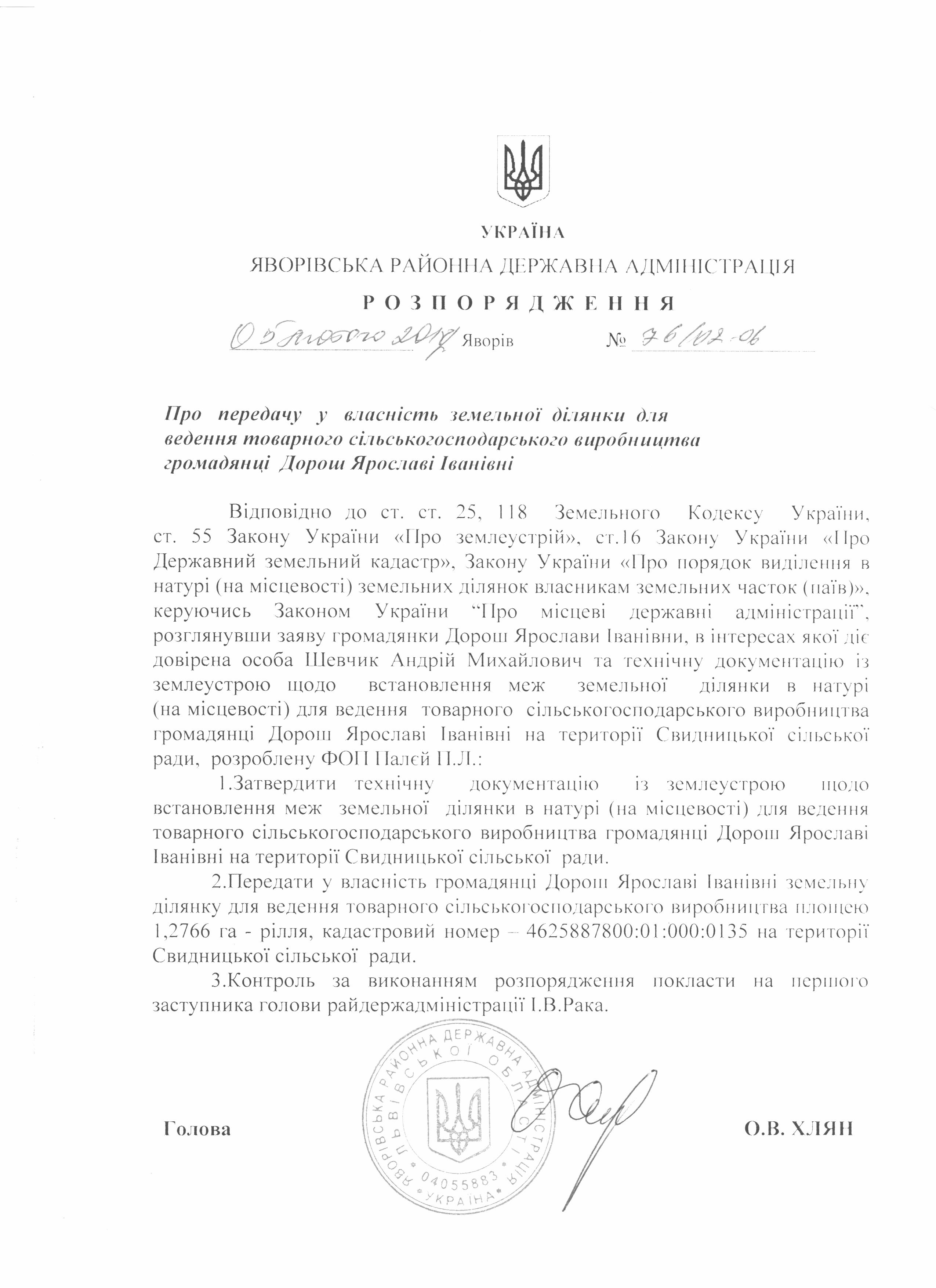 №76/02-06 2018-02-08 Про передачу у власність земельної ділянки для ведення товарного сільськогосподарського виробництва громадянці Дорош Ярославі Іванівні