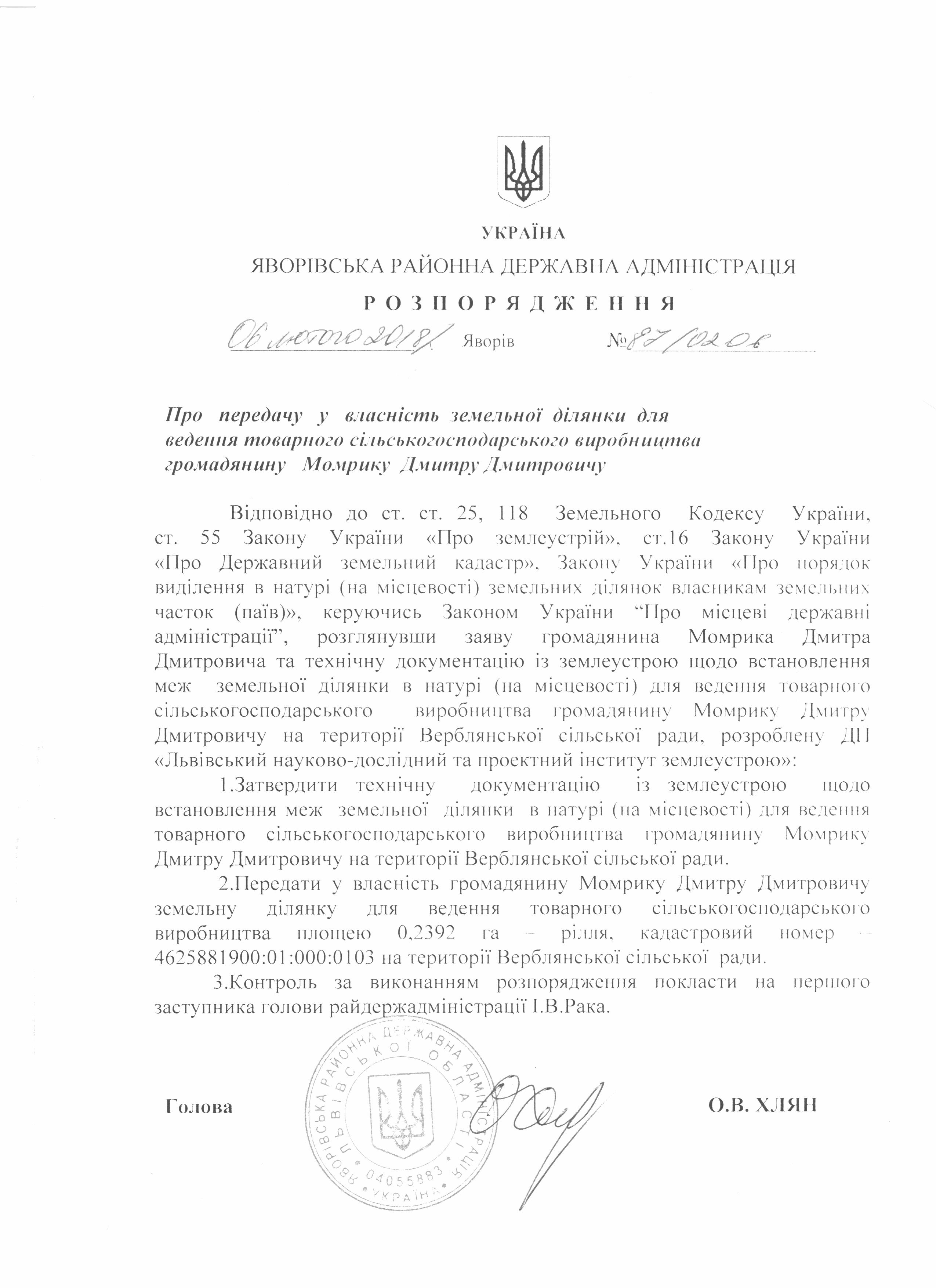 №87/02-06 2018-02-12 Про передачу у власність земельної ділянки для ведення товарного сільськогосподарського виробництва громадянину Момрику Дмитру Дмитровичу