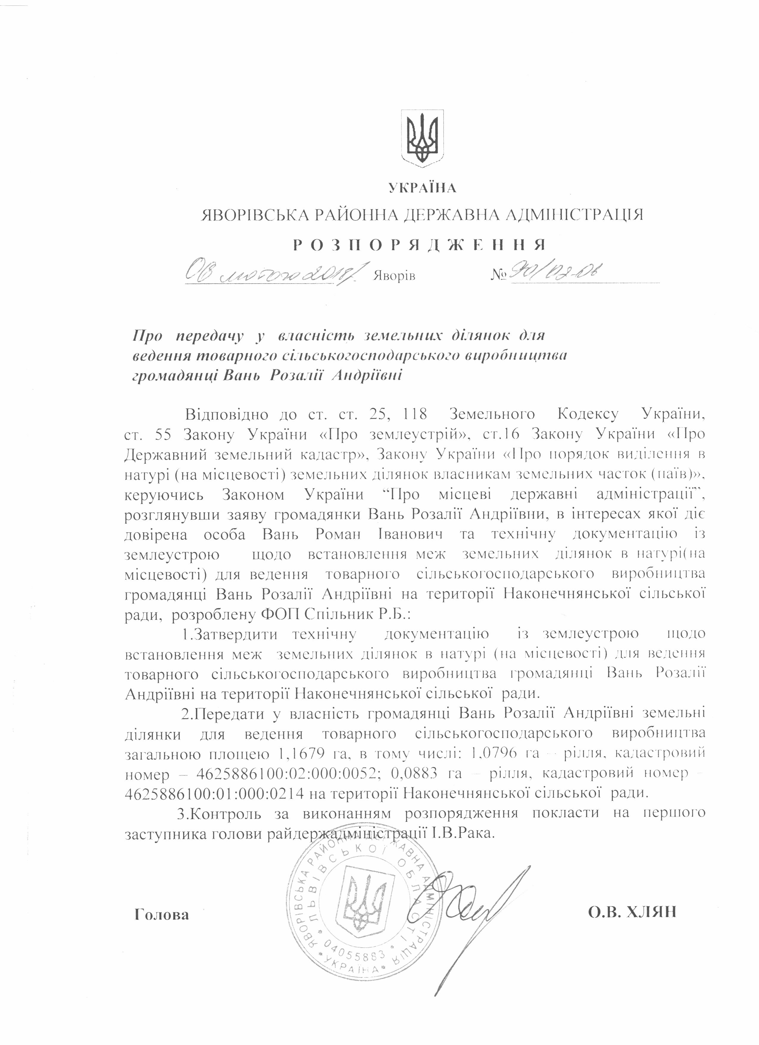№90/02-06 2018-02-12 Про передачу у власність земельних ділянок для ведення товарного сільськогосподарського виробництва громадянці Вань Розалії Андріївні