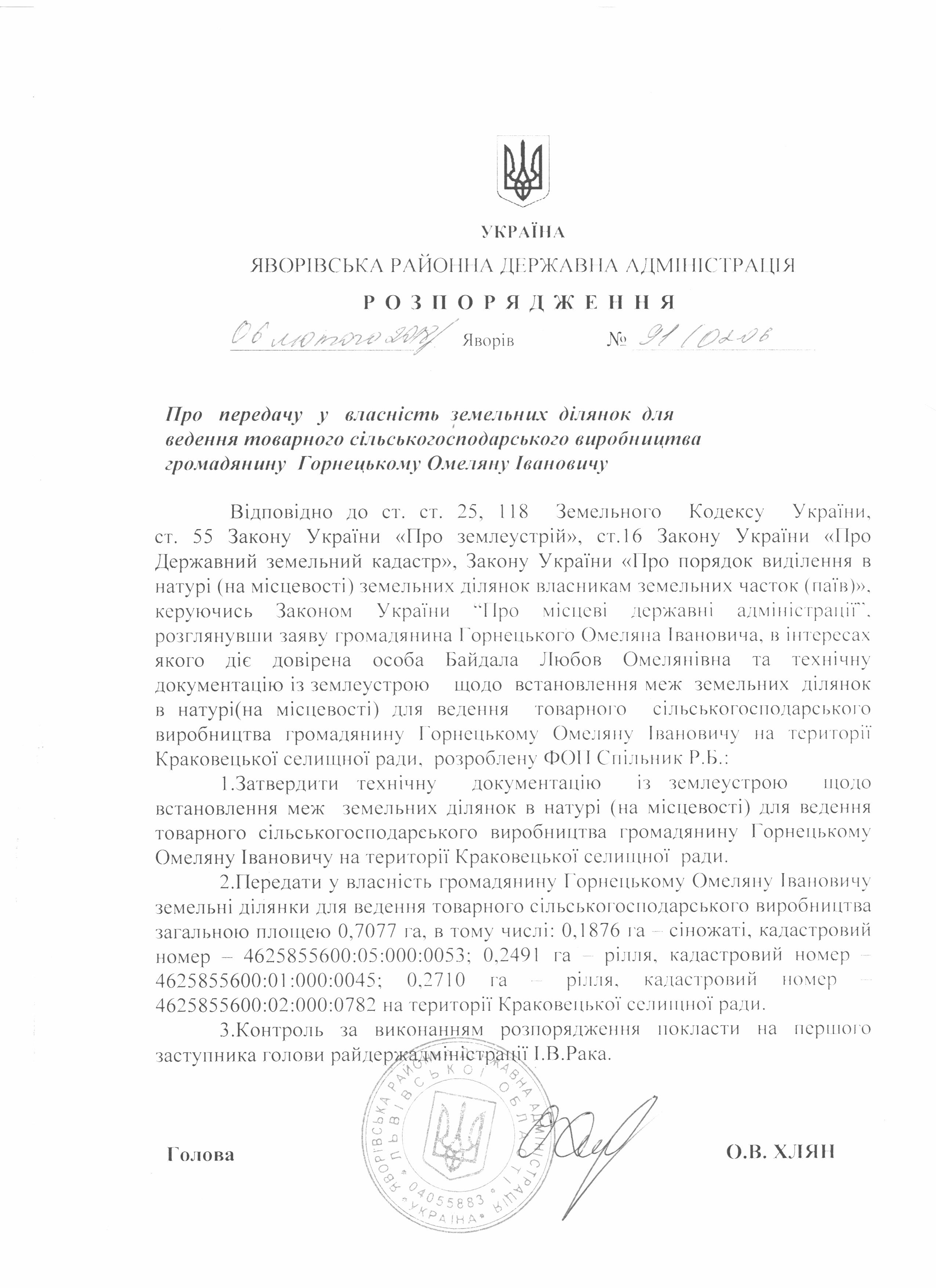№91/02-06 2018-02-12 Про передачу у власність земельних ділянок для ведення товарного сільськогосподарського виробництва громадянину Горнецькому Омеляну Івановичу