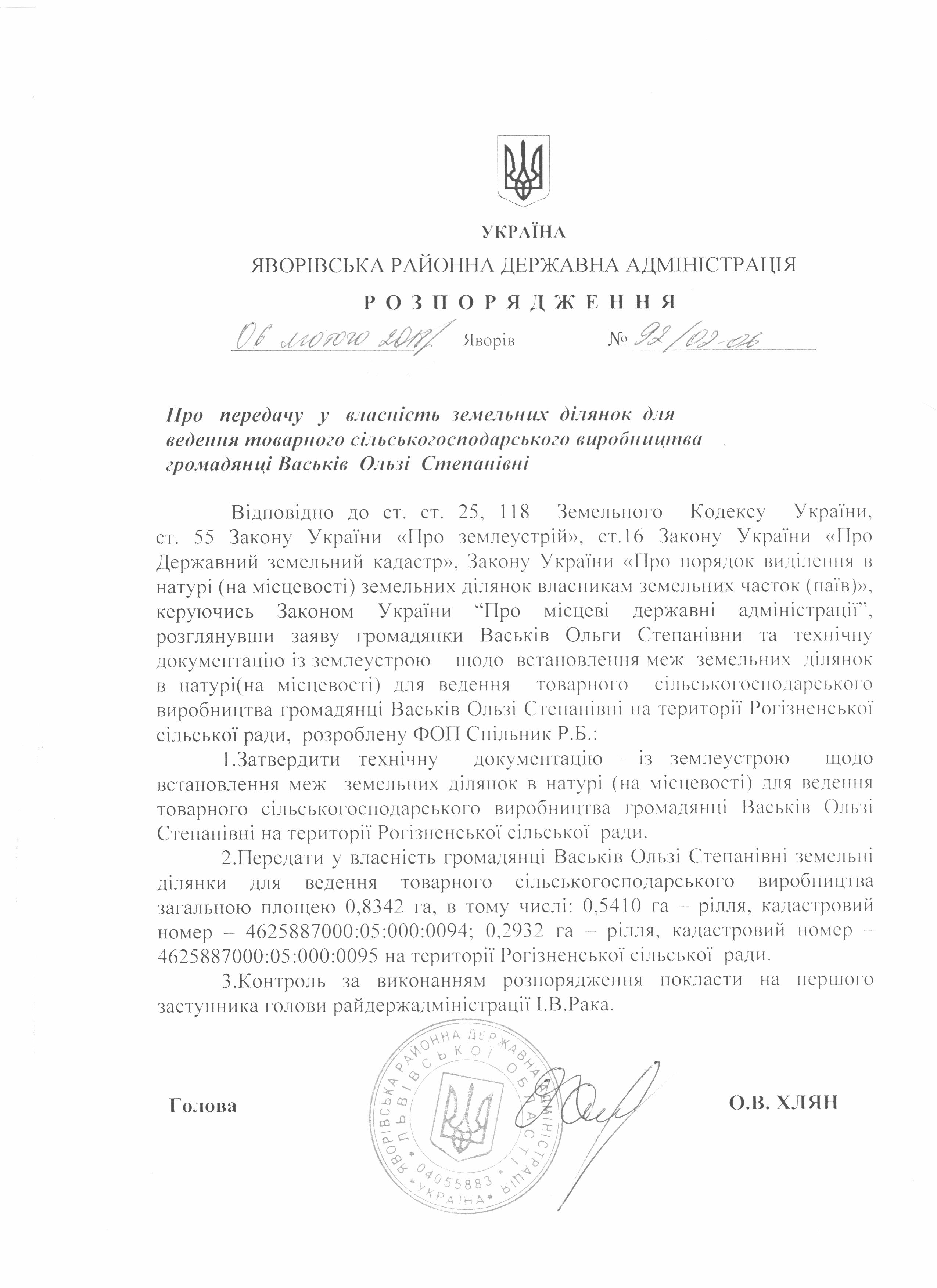 №92/02-06 2018-02-12 Про передачу у власність земельних ділянок для ведення товарного сільськогосподарського виробництва громадянці Васьків Ользі Степанівні
