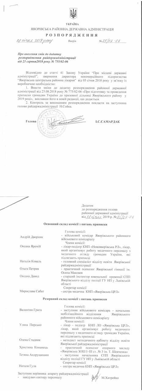 №25/02-06 2019-01-14 Про внесення змін до розпорядження Яворівської районної державної адміністрації від 23 серпня 2018 року № 755/02-06