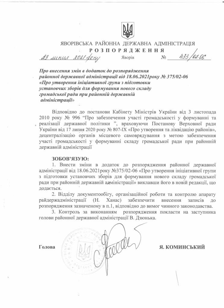 433/02-06 2021-07-23 Про внесення змін в додаток до розпорядження районної державної адміністрації від 18.06.2021 року №375/02-06 "Про утворення ініціативної групи з підготовки установчих зборів для формування нового складу громадської ради при районній державній адміністрації"