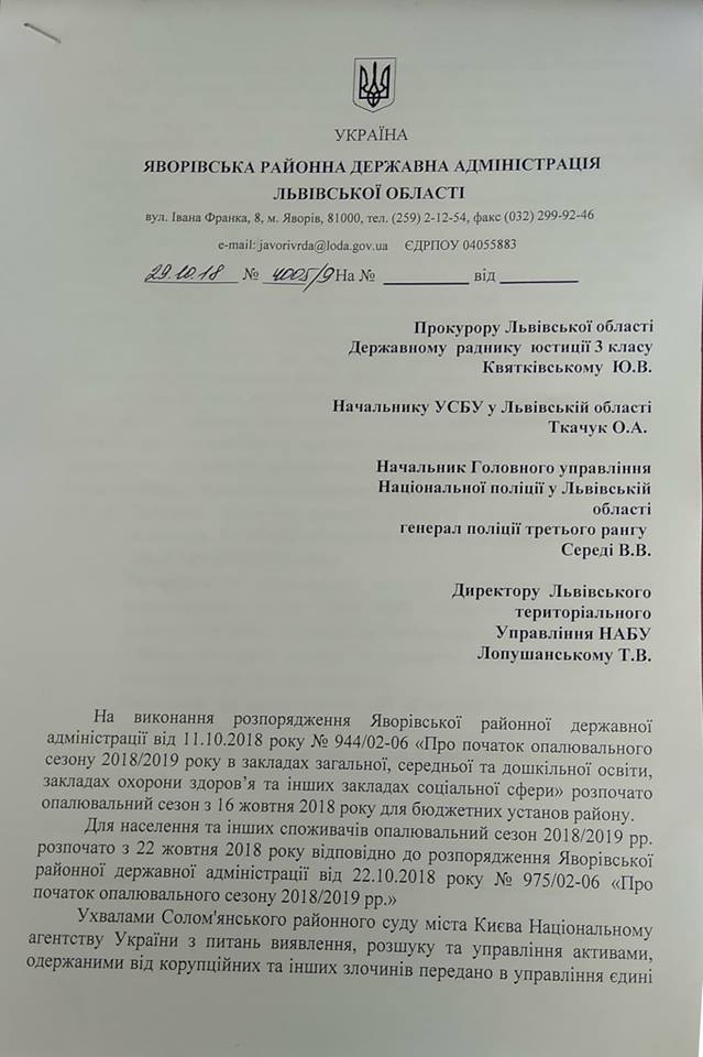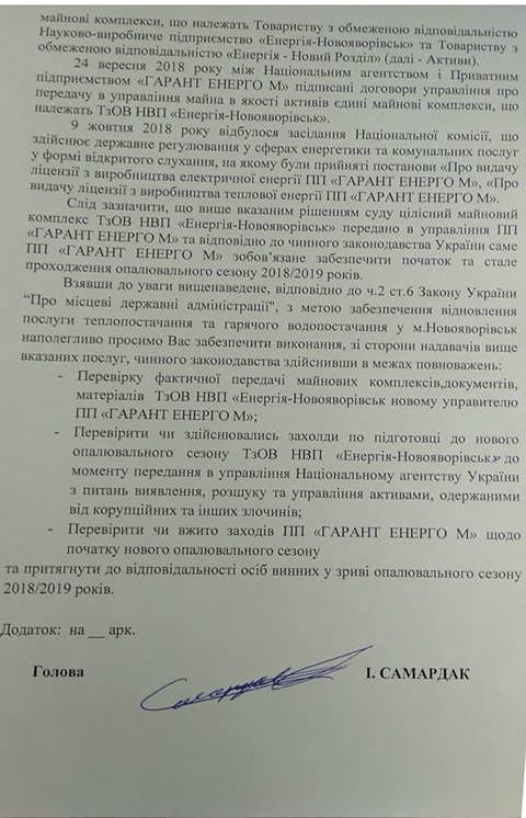 Взявши до уваги вищенаведене, відповідно до ч.2 ст.6 Закону України “Про місцеві державні адміністрації", з метою забезпечення відновлення послуги теплопостачання та гарячого водопостачання у м.Новояворівськ наполегливо просимо Вас забезпечити виконання, зі сторони надавачів вище вказаних послуг, чинного законодавства здійснивши в межах повноважень:
