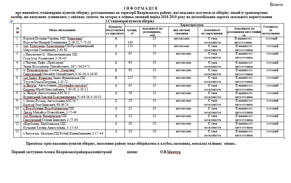про наявність стаціонарних пунктів обігріву, розташованих на території Яворівського району, які можливо залучити до обігріву людей із транспортних